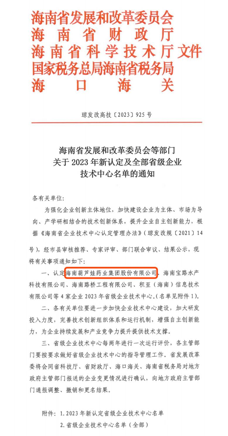 近日,海南省发改委等多部门联合公布了《关于2023年新认定及全部省级企业技术中心名单的通知》,其中,海南PA视讯药业集团股份有限公司成功通过评审,被认定为省级企业技术中心,是本次获批的4家企业之一。